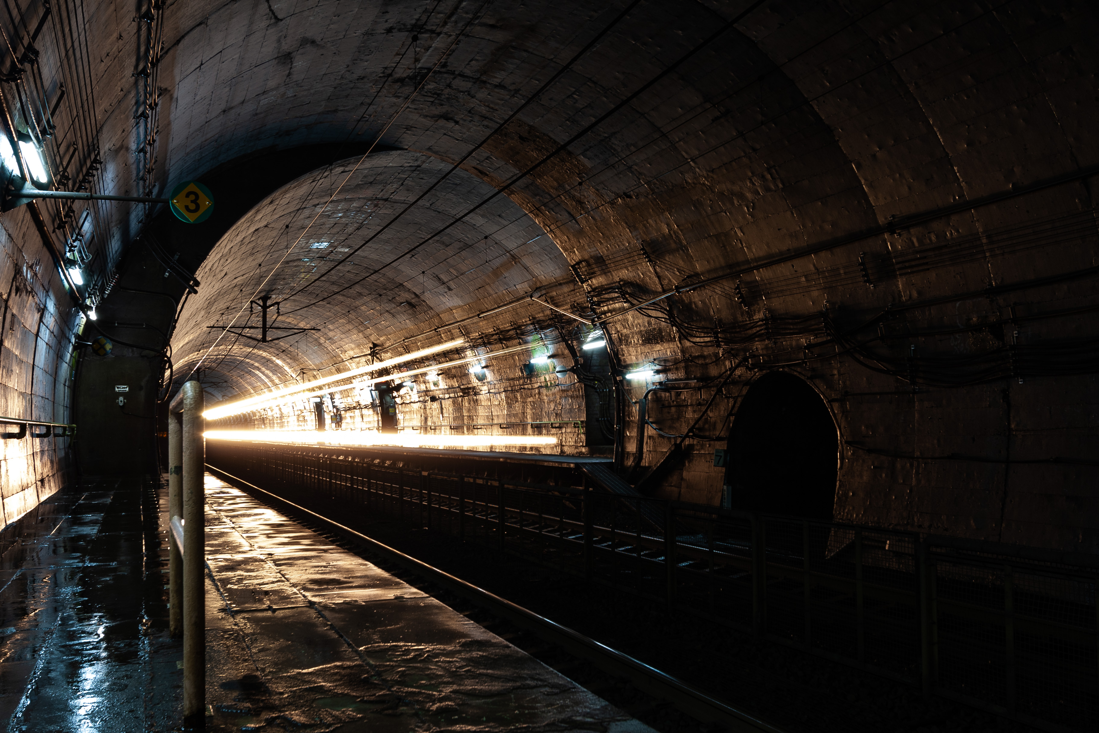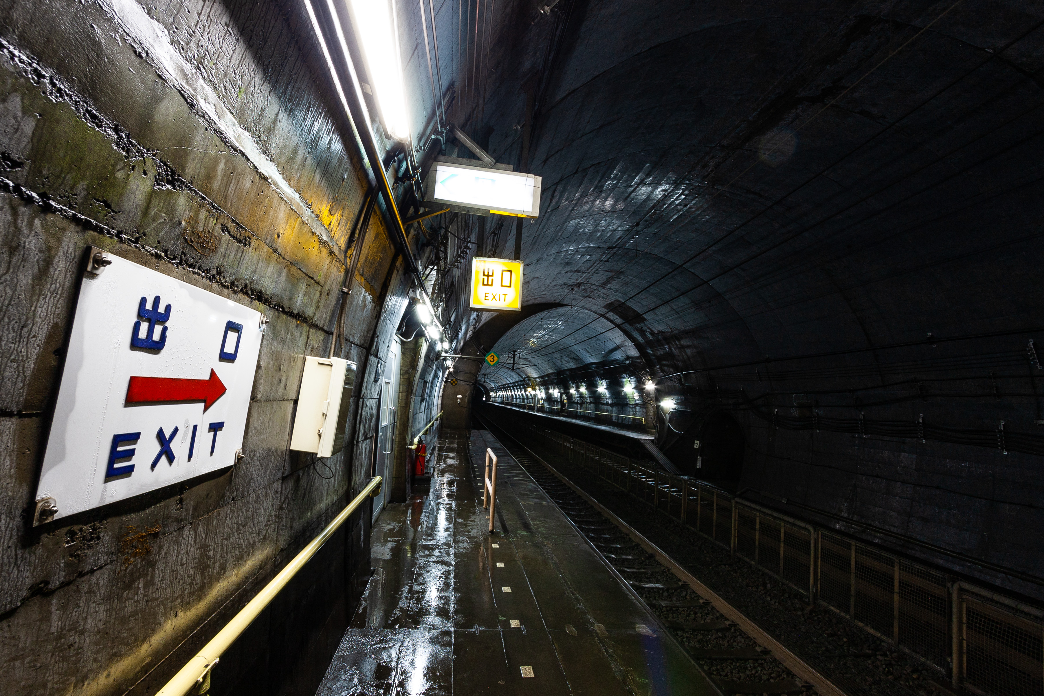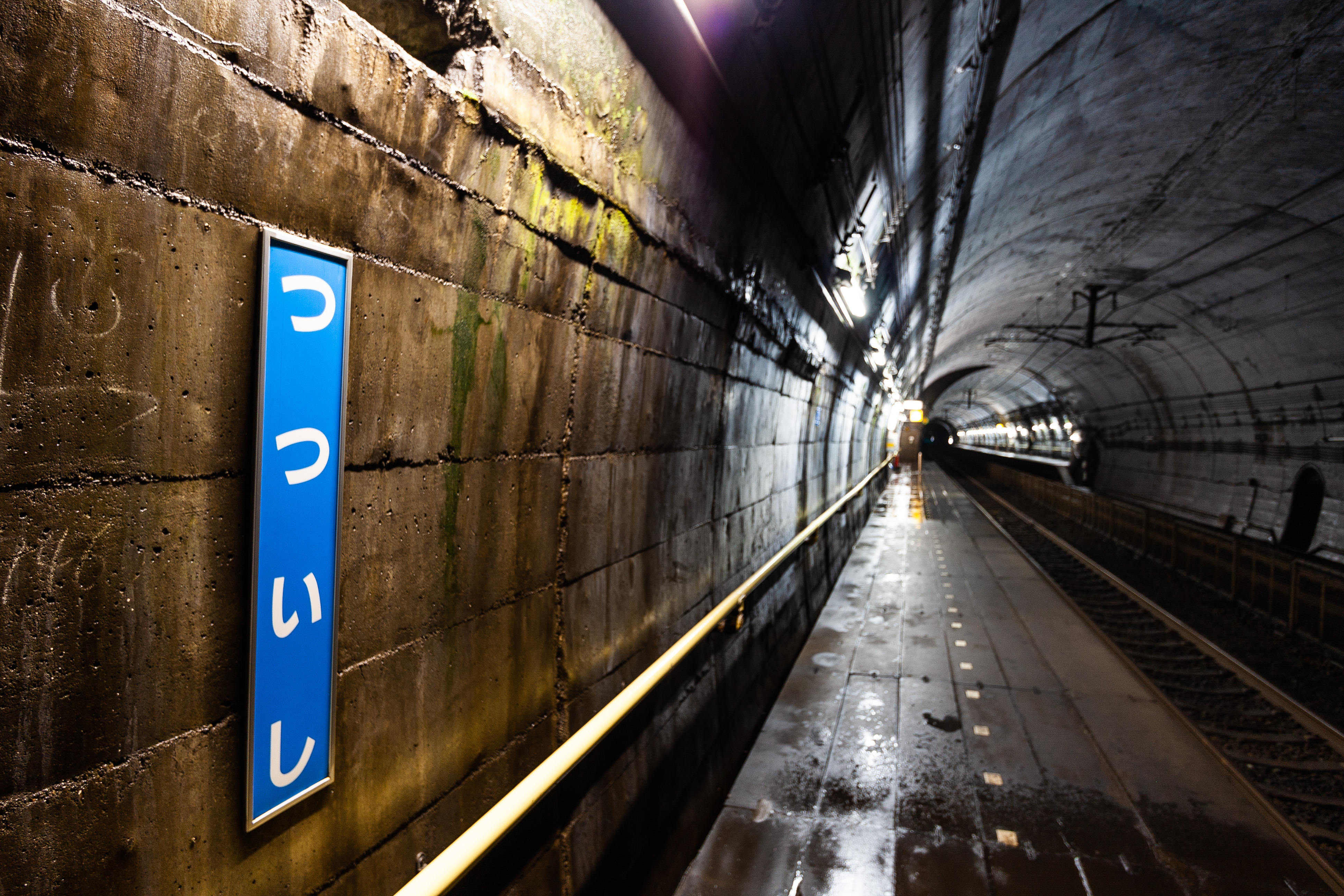 電車が通らない間は、無数から湧き出た地下水の音が絶えず続きます。 上下線の中間には、バラスト飛散防止用の金網が設置されています。