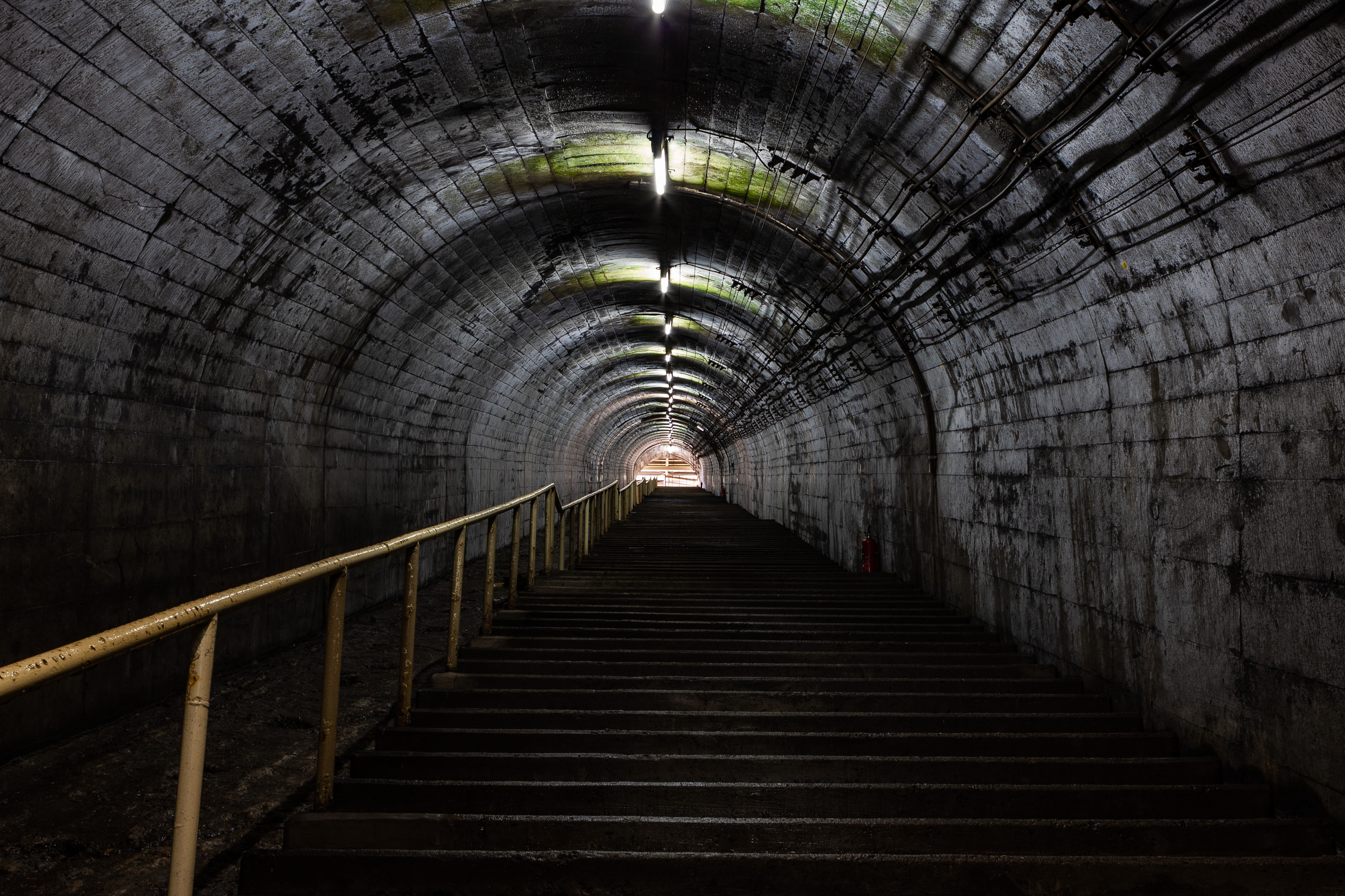 こちらの斜坑階段での境目で、連絡通路側の地下の冷たい空気に対して、斜坑の蒸し暑い外気温のような変化が感じ取れました。