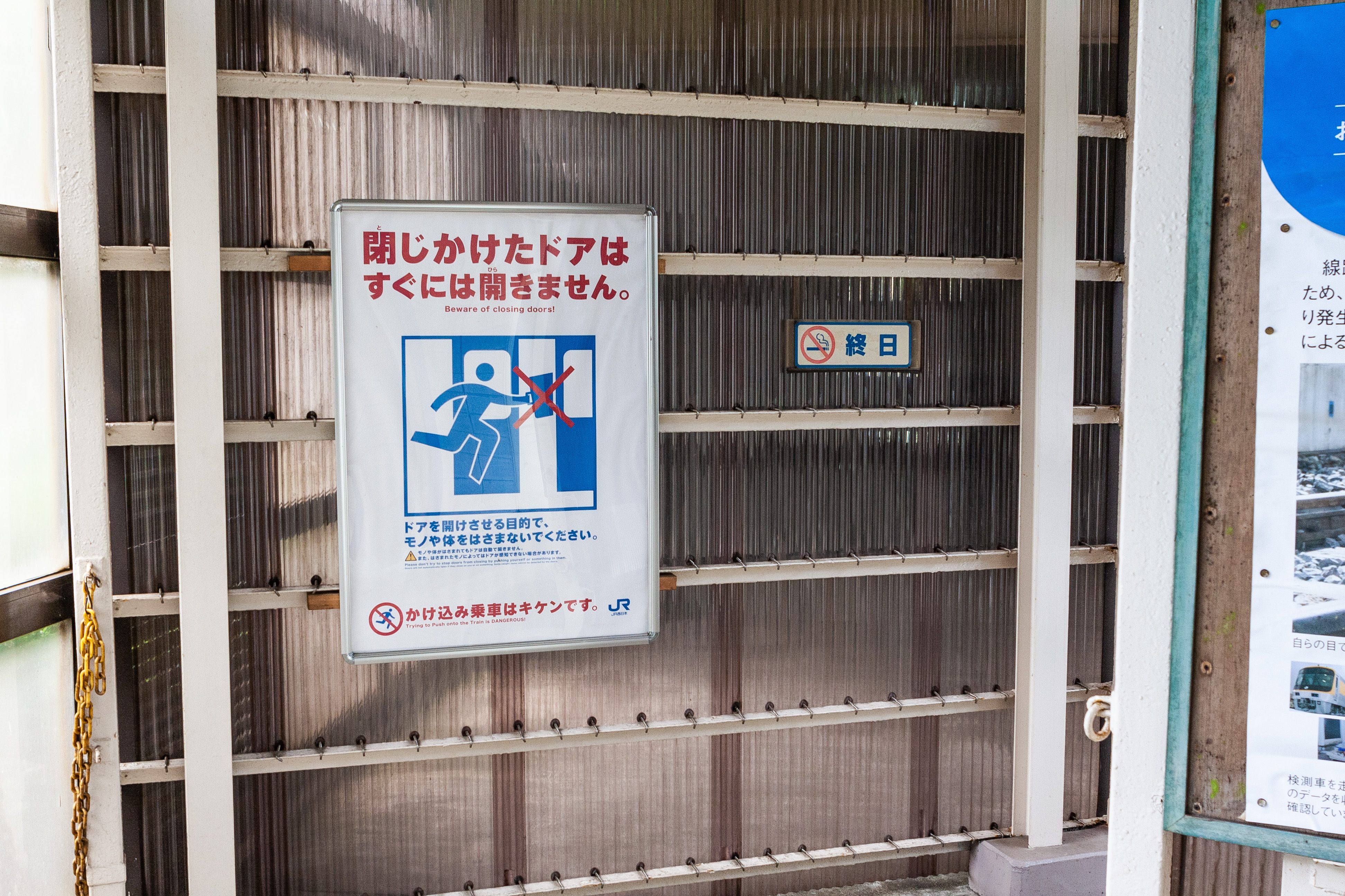 坑口にある風よけ衝立には、駆け込み乗車防止のポスターが掲示されていました。 この駅と北越線の普通列車停車時間を考えるとシュールさを感じます。